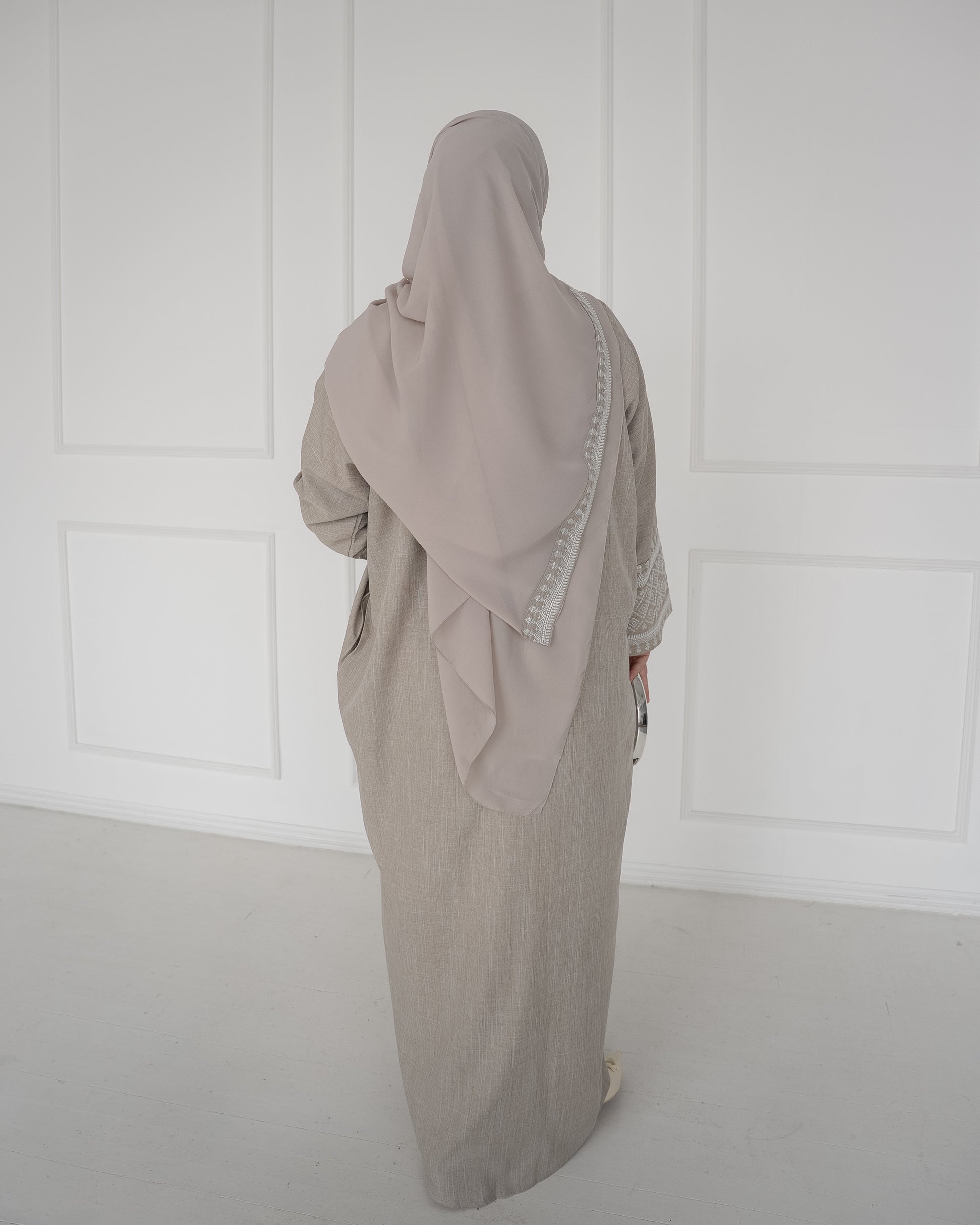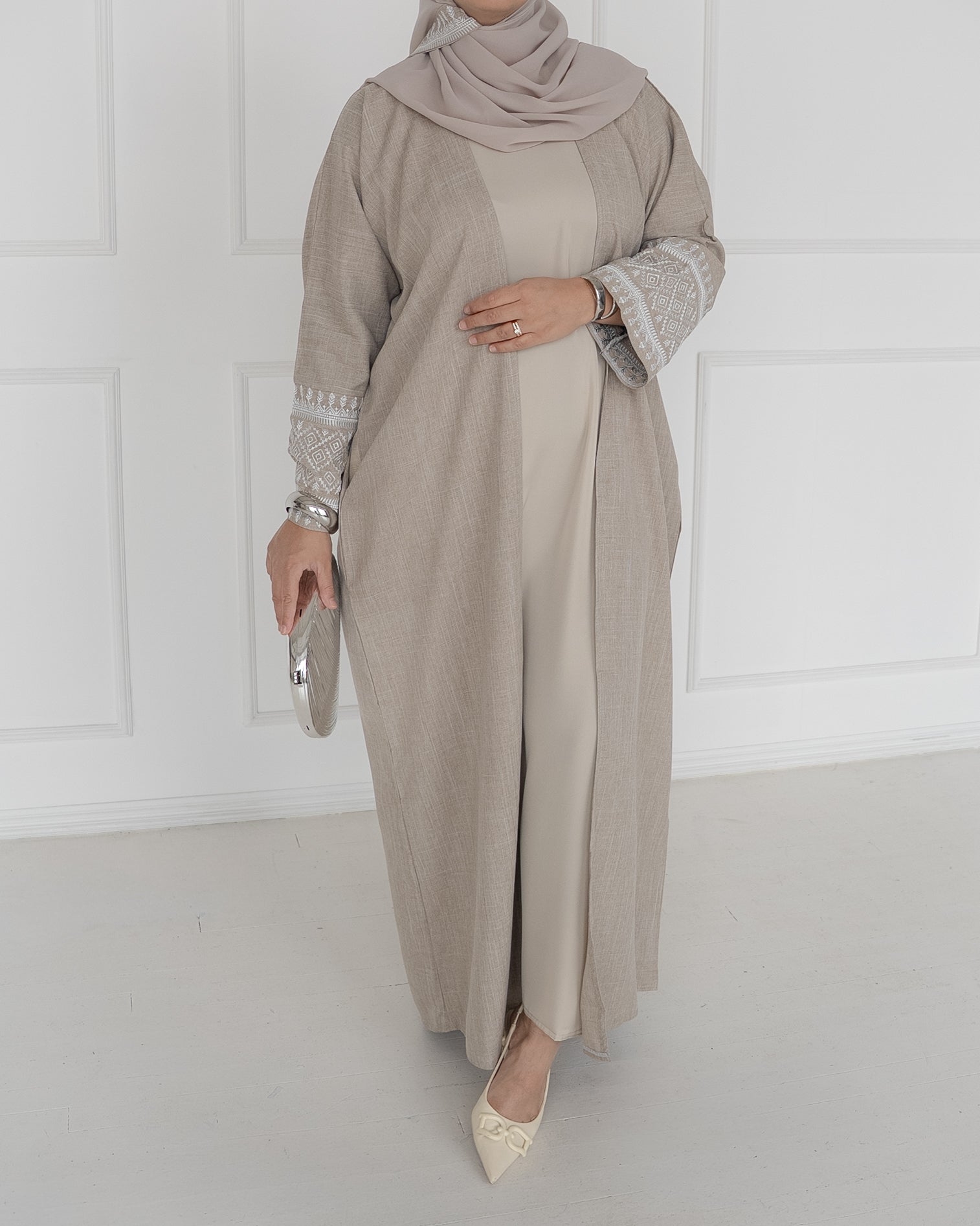 • An open abaya adorned with exquisite ivory hand embroidery across the sleeves - a reflection of delicate craftsmanship and grace.